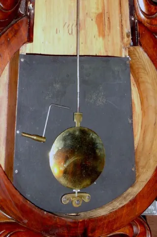 the entire case has been stripped and refinished, and the back board sanded front and rear, taking away fly specs and patina that some owners cherish....
