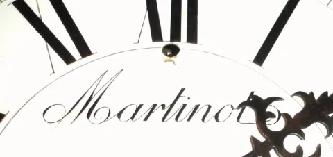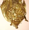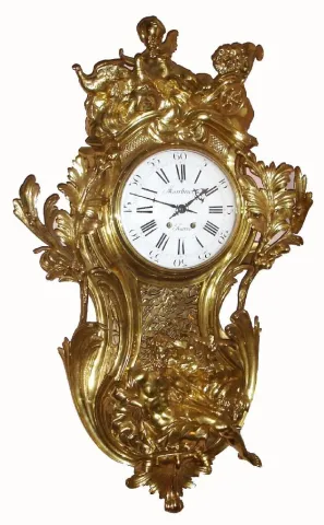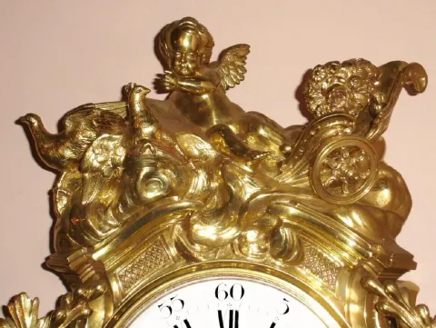 French, Martinot, Paris, very large ormolu cartel clock, the case surmounted by a cherub having spilled out of a chariot pulled by a swan, the bottom of the case showing a reclining Zeus with an eagle at his side, 8-day, time and strike. the leafy trim on the right side of the case got bent in shipment, and we have left it that way. The entire case has been polished and lacquered. The porcelain dial is excellent, and the signature strong. Hands are original. Ht 38"