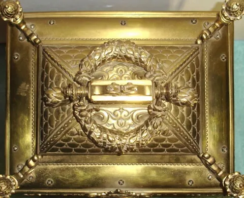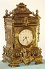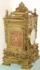 European, a very large Victorian cast brass table clock, with an equally large double chain fusee movement with heavy solid plates. Strikes the hours on a very large coiled wire cathedral gong. The case is profusely decorated with leaves and swags, a winged cherub below the 7" silvered dial with Arabic numerals, + surmounted by 4 pineapple finials and giant double acanthus swags with ribbon binding, c.1880. The brass case is complete and sound, a couple of panels need tightening. It was perhaps gilded originally, and is now polished to brass. This is a high quality item, certainly a special order or limited production model. Weight approaches one hundred pounds, so ask for help when moving. Chains on the movement are intact, and it ticks and strikes, but may benefit from service before regular use. Ht 28"