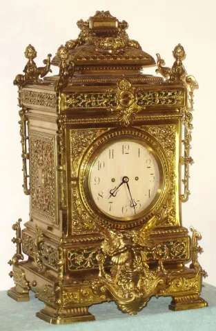 European, a very large Victorian cast brass table clock, with an equally large double chain fusee movement with heavy solid plates. Strikes the hours on a very large coiled wire cathedral gong. The case is profusely decorated with leaves and swags, a