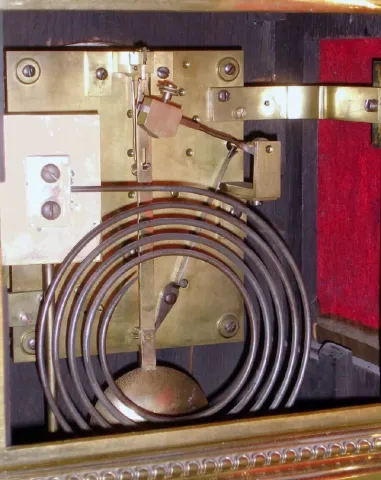 The brass case is complete and sound, a couple of panels need tightening. It was perhaps gilded originally, and is now polished to brass. This is a high quality item, certainly a special order or limited production model. Weight approaches one hundred pounds, so ask for help when moving. Chains on the movement are intact, and it ticks and strikes, but may benefit from service before regular use. Ht 28"