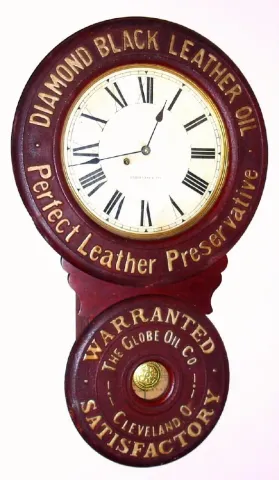 Baird Clock Co., Plattsburgh, NY, C.1893, figure 8 advertising timepiece for BLACK DIAMOND LEATHER OIL, eight day, spring. overall excellent original condition with nice aging to the gold on the letters, good original label, singed paper dial and signed movement. Ht 31"