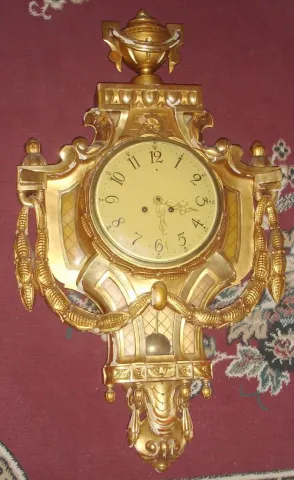 German, for the Swedish market, large gilt wood cartel clock by Lenzkirch [unsigned, but with appropriate markings], C.1900, 8-day bell strike, serial No. 1Million -- 214394.