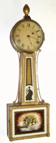 Unknown, Massachusetts, C.1820, 8-day banjo or patent timepiece, weight driven, the case with rope molded, gilt frames.