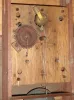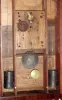 importantly this has a proper Leavenworth movement w/ period brass faced pendulum, plus an outstanding dial and good label. However there are significant restorations to the case; both scrolls are replaced, skirt and feet are replaced, door escutcheon missing, and the finials are painted pot metal; reverse tablet done by an amateur and top section of case back replaced. Seems to tick and strike fine. Estimate reflects restorations. Label with 1920 census and postage rates. Ht 31.5"