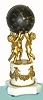 French, Vincenti and Cie, ormolu and marble figural clock, three cherubs supporting a globe with applied gilt stars and Roman numerals to designate the dial, containing the 8 day time and strike spring driven clock movement with balance / platform
