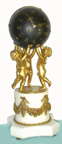 French, Vincenti and Cie, ormolu and marble figural clock, three cherubs supporting a globe with applied gilt stars and Roman numerals to designate the dial, containing the 8 day time and strike spring driven clock movement with balance / platform escapement all on a white marble plinth with applied garland trim, c1890 good running order, the case is in good condition with bright gilding on the figures who are a little loose on base, one gilt star missing from globe and no chips or damage to the white marble base. The dial and the hands are fine with all numerals present and no damage. The movement with Vincenti award medallion for year 1855. Ht 17"