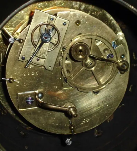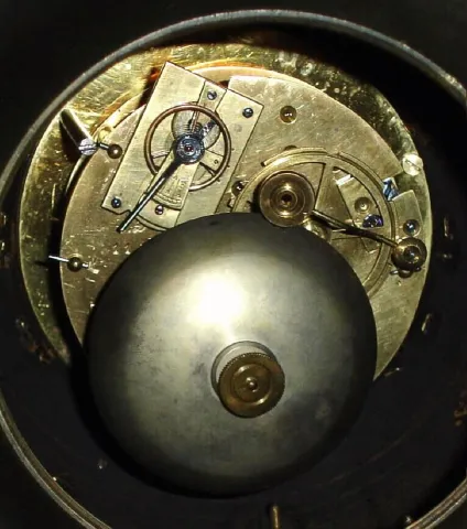 good running order, the case is in good condition with bright gilding on the figures who are a little loose on base, one gilt star missing from globe and no chips or damage to the white marble base. The dial and the hands are fine with all numerals present and no damage. The movement with Vincenti award medallion for year 1855. Ht 17"