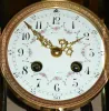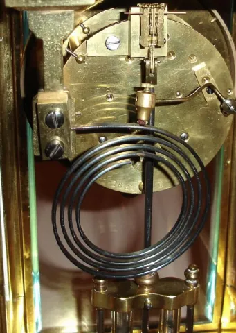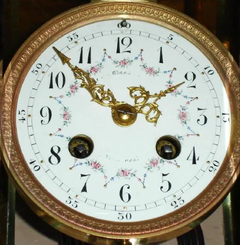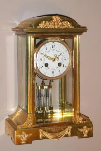 French, crystal regulator retailed by Henry Birks and Co, Montreal 8 day time/strike mvmt with the award medallion of Ls.Boname, Seloncourt, and 'Made in France', in a gilded brass case with Rococo style appliques and presentation on case front. and 2-vial compensating pendulum, c1903 good running order, glass is all good no chips. The presentation on the front of the base reads: "PRESENTED TO W. A. WILSON on the occasion of his Marriage, by his friends of the Caledonian Ins Co, 2. Sept. 1903." The dial is in good condition with no hairlines but the signature faded and just barely legible. The floral decorations intact. The hands are fancy cast brass style. Ht 13"