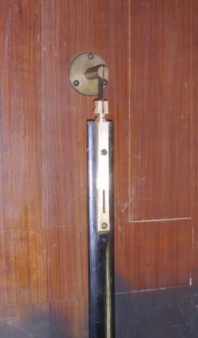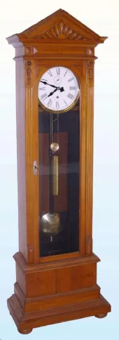 Austrian or So. German, a public building tall clock with auxiliary drive through the top for driving a large set of remote hands, probably a large gallery slave in a bank or department store. With a heavy cast iron plate movement, skeleton in form, similar to a street clock, and with a heavy meter pendulum. The mov't also with maintaining power and Graham's style dead beat escapement with adjustable pallets, C.1900 the pine case was once fake grained, and the graining is mostly intact on the inside so you can see what it would have looked like. The dial has been restored, and admittedly this is one clock that would look better with a glass dial to show off the movement. Lead filled weight is a later replacement, and more than adequate for powering the clock. Hands are original. The case has a hole in its "roof" where the aux drive shaft once passed. Other than the case refinish and dial work this appears to be an interesting and original master clock. Ht 78"