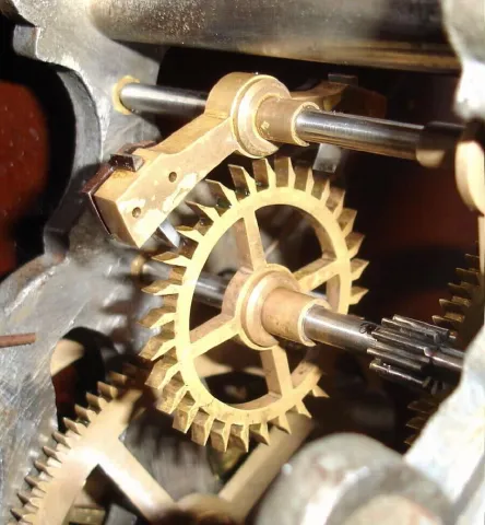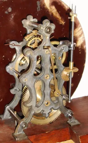 Austrian or So. German, a public building tall clock with auxiliary drive through the top for driving a large set of remote hands, probably a large gallery slave in a bank or department store. With a heavy cast iron plate movement, skeleton in form,