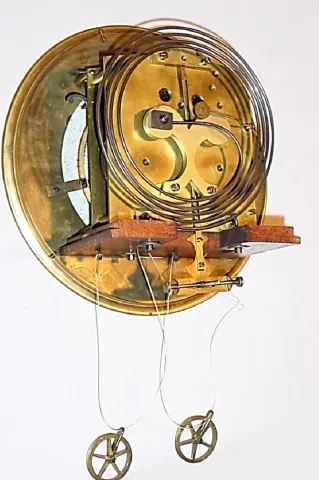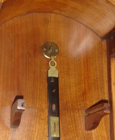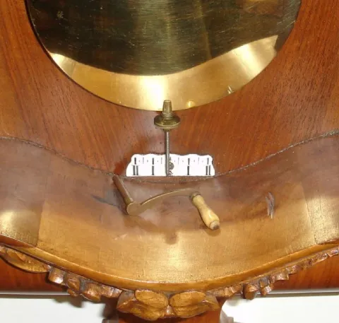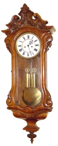 although there is a dry split on the lower edge of the door, and the case was nicely refinished, this clock is otherwise in excellent original condition. Well made Viennese movement on a slide mount, and with good pointed star finials. Has a key lock door with key intact. Nice brass backed pendulum with no dents. We sold this particular clock in May of 2006 for $3300. Ht 38.5"
