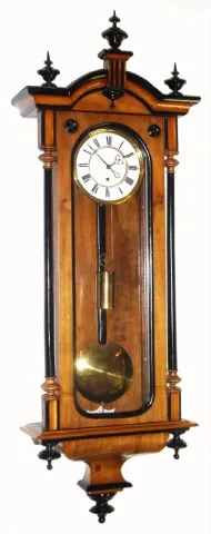 Austrian, 30-Day Vienna Regulator in a nice transitional case with smooth side columns, with ebonized accents. Has a good movement with Harrison's ratchet maintaining power. Remember to wind to the left. The case has been polished to a nice sheen and the mov't cleaned and restrung. Top finials are poplar replacements, painted black. Overall excellent condition and in running order. Weight hook got bent in transit and is hanging slightly crooked. There is a small dial chip filled in near. Ht 48"