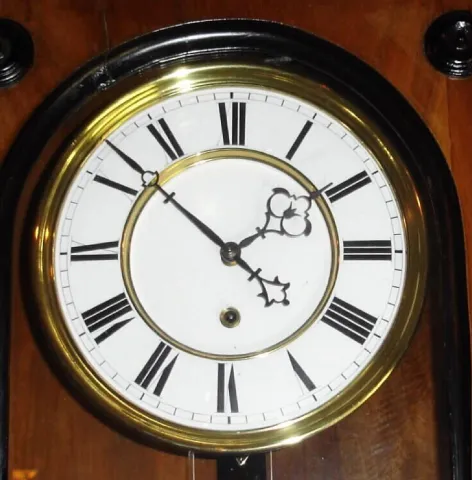 Austrian, 30-Day Vienna Regulator in a nice transitional case with smooth side columns, with ebonized accents. Has a good movement with Harrison's ratchet maintaining power. Remember to wind to the left.