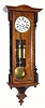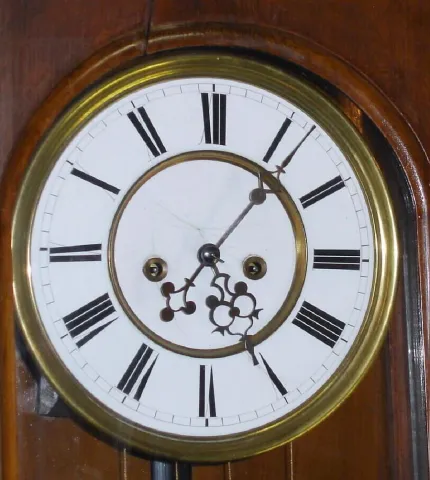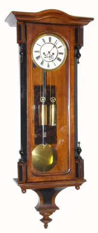 Austrian, Vienna Regulator, 2-weight wall clock, gong striking, in a simple transitional style walnut case, less top trim, C.1865 overall in nice condition, the movt clean and running. The pendulum hanger was spaced out from the case a bit to improve clearance for the pendulum, otherwise the slide mount mov't and pendulum are original to the case. Two vacant holes in case top. The porcelain dial center has a spider crack, no chips. Overall very good condition. Ht 44"