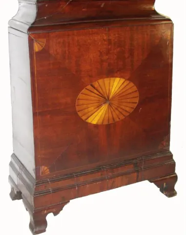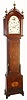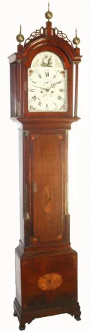 Boston area mahogany tall case clock, C.1820, 8-day, 12 inch painted arched dial, with the later applied signature of Simon Willard. The case with fan inlays on the waist and plinth, brass stop fluted quarter columns to the waist and stop fluted full