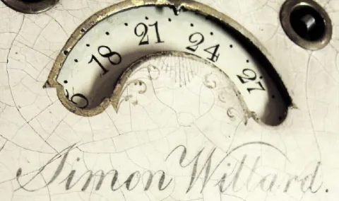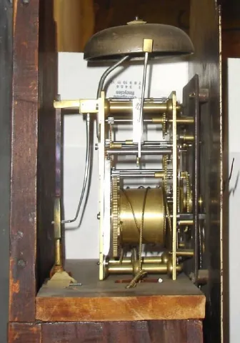 this clock looks the part of a genuine Willard, even has the proper proportions and grace. The case has been refinished. Mov't cleaned and re-cabled around 20 years ago, ticks and strikes on a bell, has smooth barrels typical of American makers. Except for the signature, the dial is original and nice; has bird in flight in the arch; English, Wilson false plate. Waist door has a warp that creates about half inch gap at bottom. Seat board is replaced. Retains good, period, "tin can" weights and the 3 finials are period as well. Ht 90"