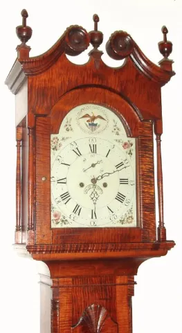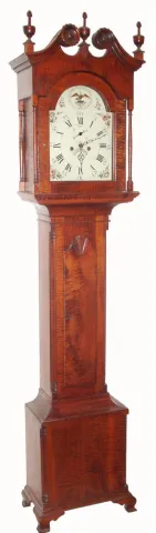 A reproduction tiger maple tall clock with scroll top and carved rosettes, full columns flanking the hood door, and quarter columns flanking the tombstone door with carved fan at top. The base or plinth of the case has matching quarter columns and well proportioned French feet. With a period [C.1830] American 8-day 2-wt time and strike movement, having a painted iron dial with Roman numerals and eagle in the arch. this is an old movement and dial in a modern case, with modern pendulum and weights. The fit of the joints and doors is excellent, the case surface itself with minor roughness to the touch. Movement is complete and sound, ticks and strikes. Ht 91"