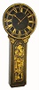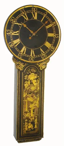 English, Time and bell strike TAVERN CLOCK, 26" dial with gilt Roman numerals, in a Chinoiserie case, the with raised figures in period dress, amongst gardens and temples, C.1800. the case was re-decorated around 1950, and with some losses and abrasion since. The movement needs work, as the crutch is not attached to the verge. Note there are empty dial feet holes in the front plate which may/? indicate that movement did not start life in the case, and the seat board is new. The iron pendulum bob is signed S. M. CLUNG, CARLISLE (cast into the iron). There are two large rectangular weights, extra heavy and the compounding pulleys under the seat board are intact. Ht 61"
