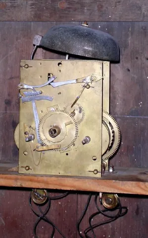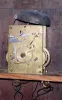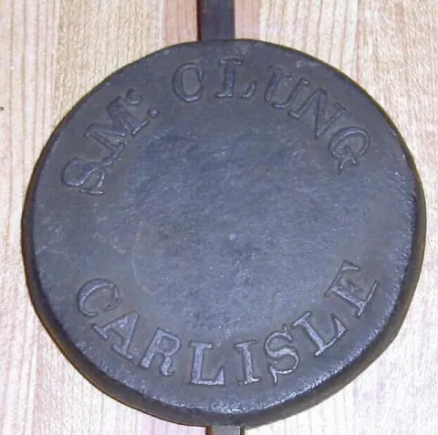 the case was re-decorated around 1950, and with some losses and abrasion since. The movement needs work, as the crutch is not attached to the verge. Note there are empty dial feet holes in the front plate which may/? indicate that movement did not start life in the case, and the seat board is new. The iron pendulum bob is signed S. M. CLUNG, CARLISLE (cast into the iron). There are two large rectangular weights, extra heavy and the compounding pulleys under the seat board are intact. Ht 61"