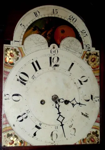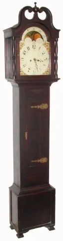 American tall clock, unsigned, 8-day with rolling moon, the last repair label from 1883, Philadelphia. Mov't with well shaped plates along the top and cut out at bottom to conserve brass. The informal country case of mixed woods retains large cast door