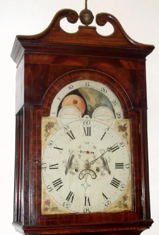 Scottish, unsigned, C.1840, arched dial tall clock with rolling moon, 8-day, 2-wt, bell strike, in a mahogany and mahogany veneer case with cross banded trim. the case retains original finish, that has been French polished over to improve the appearance; the plinth has a horizontal dry split {not too bad}. The waist door lock is missing; hood door with pull knob. The dial has as seconds dial below 12 {second hand replaced} and a simple calendar aperture above 6. There are two birds in trees painted in the center of the dial. The moon dial and floral spandrels are original; the Roman numerals and moon indications have been re-blacked. Ht 92"