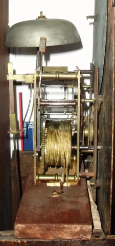 the case retains original finish, that has been French polished over to improve the appearance; the plinth has a horizontal dry split {not too bad}. The waist door lock is missing; hood door with pull knob. The dial has as seconds dial below 12 {second hand replaced} and a simple calendar aperture above 6. There are two birds in trees painted in the center of the dial. The moon dial and floral spandrels are original; the Roman numerals and moon indications have been re-blacked. Ht 92"