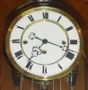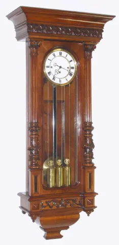 Austrian, 3-wt Grand Sonnerie, full quarter striking wall clock, in a walnut case, C.1875 this case has been nicely polished to a high sheen. There is no evidence [no holes] to indicate it ever had a top, however there is a vacant hole in the base where it had a bottom finial. The movement has been cleaned and polished to the highest standards and is in good running order. Mov't is on a slide mount, always been that way; 2 misc stray holes in case back. Dial is perfect and hands are original. The rt side glass is loose inside case, and it appears just slightly too wide to fit in the slot. Ht. 44"