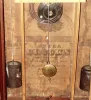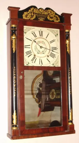 refinished mahogany veneered case is clean with restoration to the stenciled columns and splat. Some minor chips and veneer loss on the base. Mirror and hands are a replacement. Movement is brass bushed as advertised on the paper label. Ht 31.5"