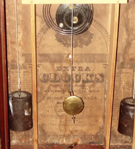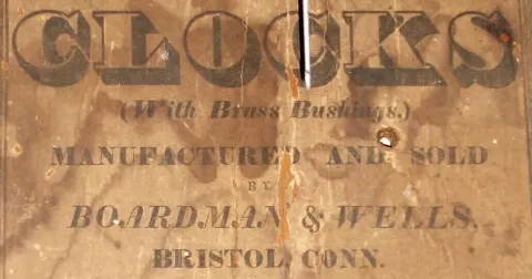 Boardman and Wells, Bristol, Conn., C.1835, 30-hour time and strike wood movement half column and splat shelf clock. refinished mahogany veneered case is clean with restoration to the stenciled columns and splat. Some minor chips and veneer loss on the base. Mirror and hands are a replacement. Movement is brass bushed as advertised on the paper label. Ht 31.5"