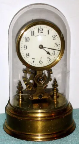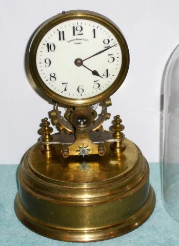 Eureka Clock Co Ltd, London battery powered, electro-magnetic timepiece mounted on brass base under dome with exposed rotating balance, serial No. 7183 c1910