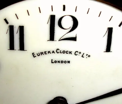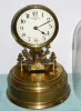 Eureka Clock Co Ltd, London battery powered, electro-magnetic timepiece mounted on brass base under dome with exposed rotating balance, serial No. 7183 c1910 the brass base is lightly oxidized, the dome has one long crack near the base, the porcelain dial is perfect. Ht 12" without dome,