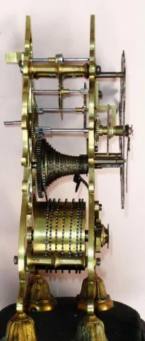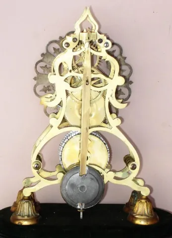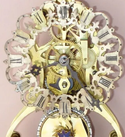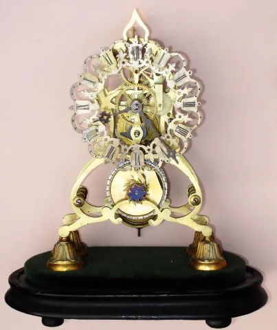 a virtually identical clock is pictured in Royer-Collard's book titled "Skeleton Clocks", page 35, and with details on page 36. We did receive a broken and taped dome to accompany the clock, only if you desire, it is not pictured, and will not survive shipment. We note that the myriad of Chinese skeleton clocks available now is confusing to the buyer, and we guarantee that this is an original English clock. There is some tarnish on the dial. Ht of clock on base = 12.5"
