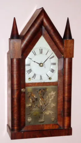 Brewster and Ingrahams, transitional production (E. C. Brewster and Co. signed mov't and dial), rare Kirk's patent iron back-plate repeating mov't (rack and snail), in a rosewood steeple case, C.1843. note Brewster had purchased Charles Kirk's clock manufactory in 1833, and there was a quantity of movements left over after Elias and Andrew Ingrahams came on board. Their early years were marked by a large export business to the UK, and this clock was returned from a small town in Derbyshire. Mov't needs cleaning. Veneer has a vertical repair on the left side, a small chip above rt door hinge, however is overall very good. Door latch is missing, has old substitute knob. The label is outstanding. Cut tablet is super. Ht 20"