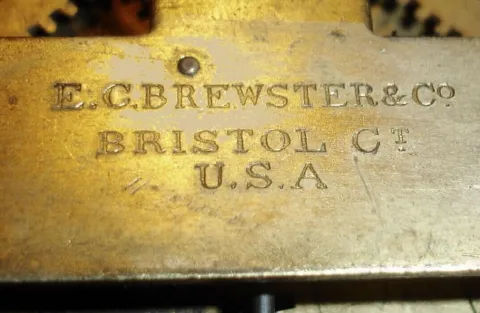 note Brewster had purchased Charles Kirk's clock manufactory in 1833, and there was a quantity of movements left over after Elias and Andrew Ingrahams came on board. Their early years were marked by a large export business to the UK, and this clock was returned from a small town in Derbyshire. Mov't needs cleaning. Veneer has a vertical repair on the left side, a small chip above rt door hinge, however is overall very good. Door latch is missing, has old substitute knob. The label is outstanding. Cut tablet is super. Ht 20"