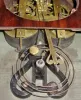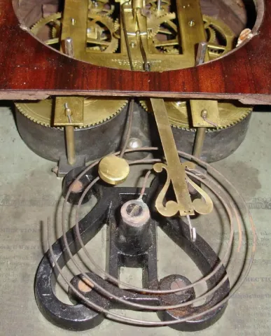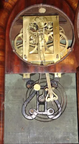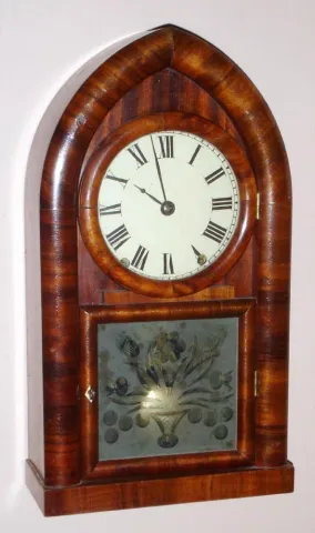 Brewster and Ingrahams, Bristol, Conn, C.1845, Kirk's patent iron back plate, repeating mov't [rack strike] in a beehive case with mahogany veneer. this is a nice early beehive. There are some bubbles in the veneer, but it appears the finish on the good veneer is original and has been waxed to a high sheen. There is a hole in the back above the mov't, drilled to hang the clock. Retains Brewster design lyre shaped decorative pendulum hanger and the original wooden dial [dial paint is recent]. Label is dark, however is all there and legible under strong light. Note early lyre gong base. Ht 19"