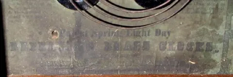 this is a nice early beehive. There are some bubbles in the veneer, but it appears the finish on the good veneer is original and has been waxed to a high sheen. There is a hole in the back above the mov't, drilled to hang the clock. Retains Brewster design lyre shaped decorative pendulum hanger and the original wooden dial [dial paint is recent]. Label is dark, however is all there and legible under strong light. Note early lyre gong base. Ht 19"