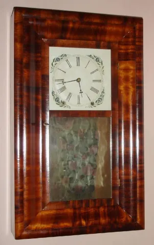 outstanding condition. The clock sold to the current owner on January 7, 1986 at Bournes SPOSATO sale, session 2, lot 281, for a hammer price of $375. Since then the mirror was re-silvered and a small flake near numeral 11 nicely filled in. Retains a fine label. Refinished long ago, as shown in Bourne's catalog, and with nice patina. One of the most uncommon OGs around. In good running order. Ht 23.2"
