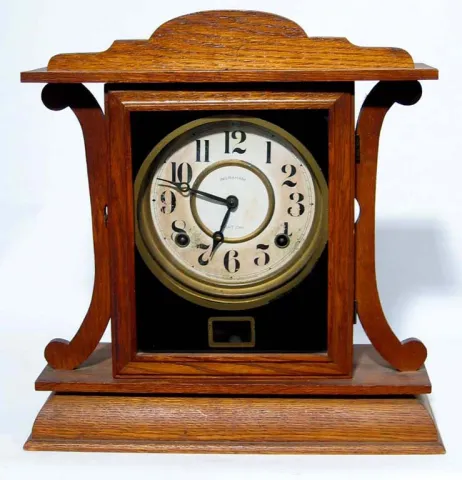 Ingraham solid oak "kitchenette" or cabinet style. Good original condition with no problems. 8 day with strike. The works need cleaning. 13".