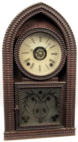 It will be hard to find a more honest, original example. The rosewood case is in the dark untouched original finish. I do not see one case nick, blemish, chip or scratch. The cut glass tablet is excellent. The painted dial has a small whitish area under the 12, possibly from someone who started to clean it and wisely went no further. Original pendulum and barbed steel hands. The label is quite good. Signed 8 day movement with strike and alarm. It has not been cleaned in many years. 18" tall.