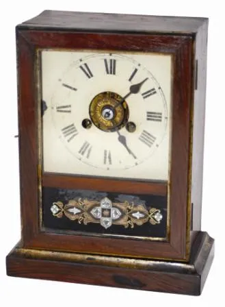 The movement is not signed, complete label inside has a big eagle and a banner with the inscription, "E. Pluribus Unum". 9" high case may be mahogany ...