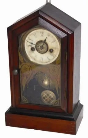 Cottage clock, possibly German. There is a black label on the base but I cannot read it, and the backboard, inside, is covered with oil cloth paper.