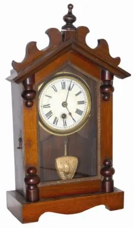 German mantle clock. 16" high walnut case has several wood ornaments and turnings, also ripple around the door.