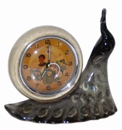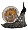 Animated novelty clock that features a ceramic peacock with an alarm clock on its back. The case is 8" wide and almost 8" high.