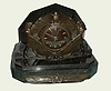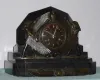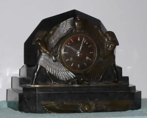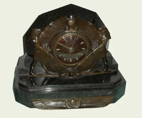 Art Nouveau French marble and bronze table clock 8 day time and half hour mov't strikes on bell, in Egyptian motif marble case with bronzed dial and silvered baton hands and hour markers flanked by bronze serpents and figures of Ra and supported by a tortoise, c1915 Good running order, replaced platform escapement, the dial may be a replacement, the case has several hairlines a couple of minor repairs (mostly in the rear). The bronze figures and mounts are very nicely patinated. Ht 9 1/2"