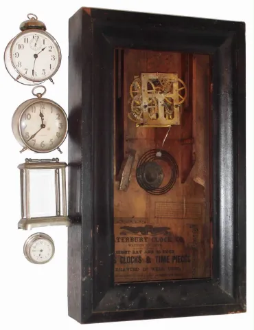 Clocks- (2) alarm clocks: a Gilbert, another small clock, an ogee case and movement a clock statue and a carriage clock case only with only one glass parts lot and multiple lots sold "as is". No further condition report available.