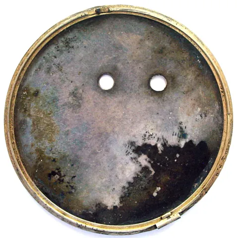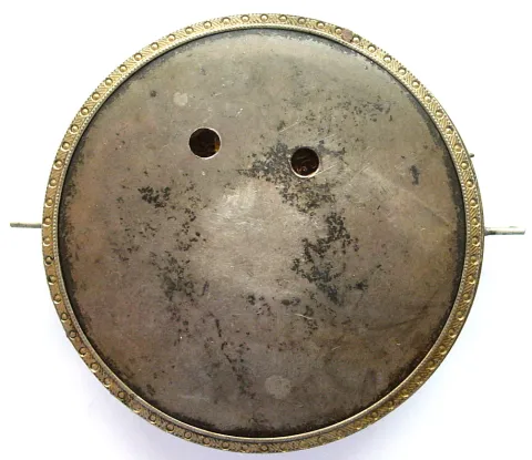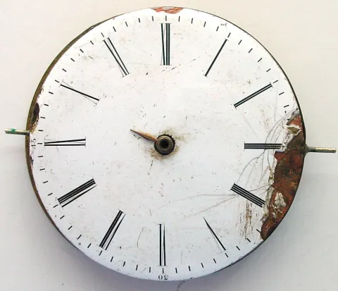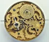 ticks and stops, the movement is in good condition with only minor oxidation. The case is as described above with only the movement housing and silver cuvette remaining. The dial is damaged with a large chunk out of the left side near 8 and 9. No hands and no crystal.