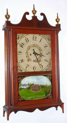 Someone has attempted to copy a Terry pillar and scroll clock with mixed results. It is a mahogany case with a backboard and label from a Burr and Chi...