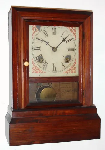 J.C. Brown, Bristol Conn., rosewood, 8-day time and strike cottage clock, C.1845. Refinished case with veneer lifting on top left of side, but no losses. Very good paper label. Painted metal dial, with red corner spandrels, has crazing and losses around winding holes, etc. Movement ticks and strikes on bell, but may need cleaning. Both glasses clear and recent. Ht.15".