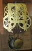 Refinished case with veneer lifting on top left of side, but no losses. Very good paper label. Painted metal dial, with red corner spandrels, has crazing and losses around winding holes, etc. Movement ticks and strikes on bell, but may need cleaning. Both glasses clear and recent. Ht.15".